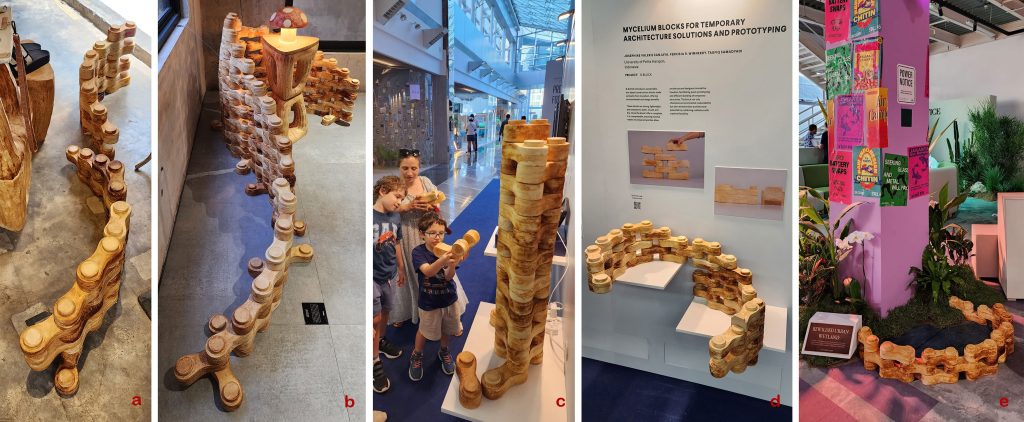 The B-Blocks project aims to facilitate a paradigm shift towards regenerative construction practices. The project seeks to create a circular economy within the construction sector, where waste is minimized and resources are continuously cycled back into the environment. Unlike traditional materials, mycelium-based blocks can grow rapidly in a controlled environment using agricultural waste as their substrate. Its modular attributes grant architects and designers creative freedom, enabling rapid prototyping and efficient construction of temporary structures. This approach not only reduces the carbon footprint but also offers a biodegradable solution that decomposes at the end of its life cycle.